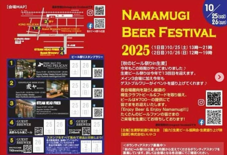 10月10日~11日:南武線ビアマルシェ 9月27日~28日:秋祭り in ラゾーナ 9月21日:TRY!盆踊り 9月13日~14日:コスギカレーフェス2025@等々力緑地正面広場 9月6日:プラザde昼のみ@川崎市民プラザ 8月28日~31日:八丁畷ビール祭り2025 8月23日:Tap Take Over @ Ben's slop shop 吉祥寺 7月18日~21日:武蔵小杉 Craft Beer Park@こすぎコアパーク 6月28日~29日:西門アーケード BEER Festival@相模原の西門商店街アーケード内 6月13日~15日:Japan Craft Fes 2025@川崎ラゾーナプラザ 5月31日:2025 むさし府中ビール祭り 5月23日~25日:CURRY&BEER FESTIVAL 2025 in 川崎 4月25日~27日:いなげ カンパイ ビア デイ 2025 Spring 3月30日 : TSUNASHIMA CRAFT BEER FEST 3月21日~23日 : Currey & Beer Festival 藤沢 サンバール広場2024年