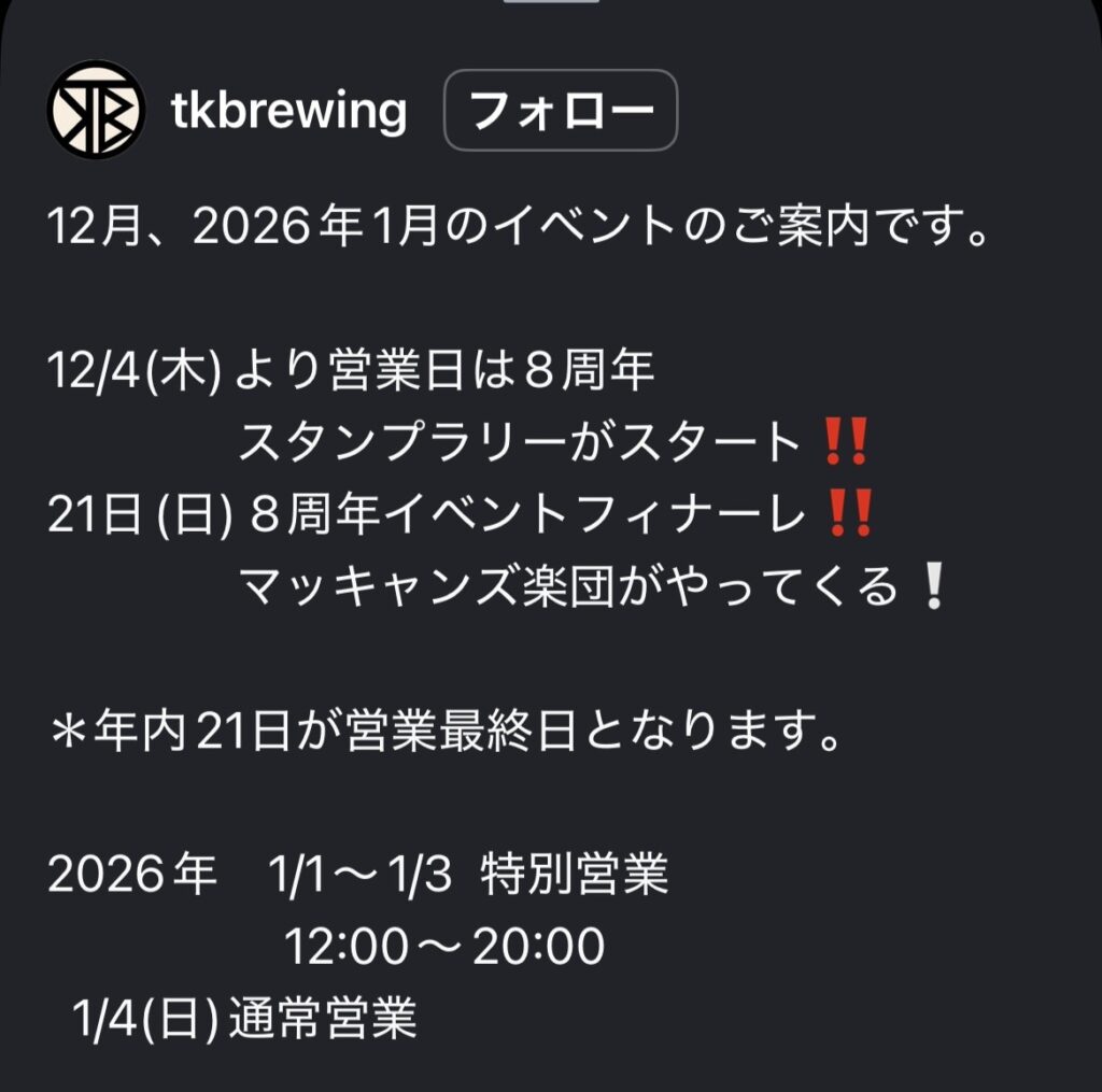 12月22~24日:TKBrewing 6周年祭 11月17~18日:SAIWAIにぎやかフェス @ 川崎駅西口東芝未来科学館前11月12日:コスギカレーEXPO @ JR南武線向河原 NEC 10月29日:NAMAMUGI BEER FESTIVAL @ 生麦 10月20~22:カンパイビアデイ 2023 秋 @ 稲毛公園 10月8日:クラフトビール street @ JR蒲田東口 9月23~24日:秋祭り in ラゾーナ川崎プラ @ ラゾーナ川崎プラザ 9月9日:川崎駅前フェス @ JR川崎駅東口 ルフロン前広場 9月2日:プラザ de 昼のみ @ 川崎市民プラザ 8月25~26日:川崎ビール祭り 2023 in Park Line @ 八丁畷駅前 8月4~6日:CRAFT BEER PARK @ ラゾーナ川崎プラザ 4月29~30日:カンパイビアデイ 2023 spring @ 稲毛公園